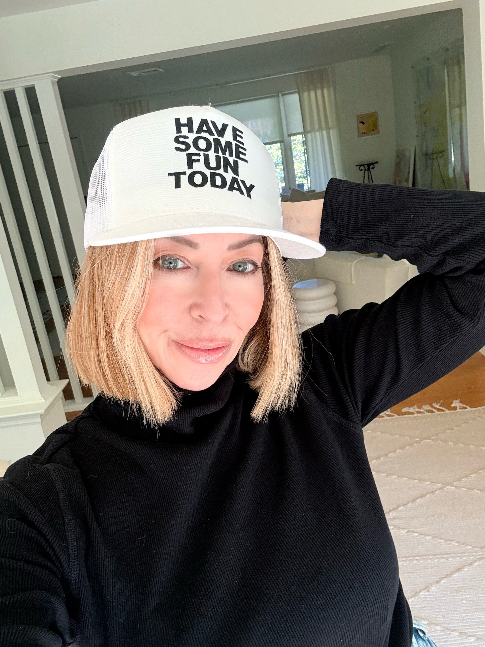 White five-panel trucker with "Have Some Fun Today" embroidered in black. Mesh back, snapback fit, everyday mindset.