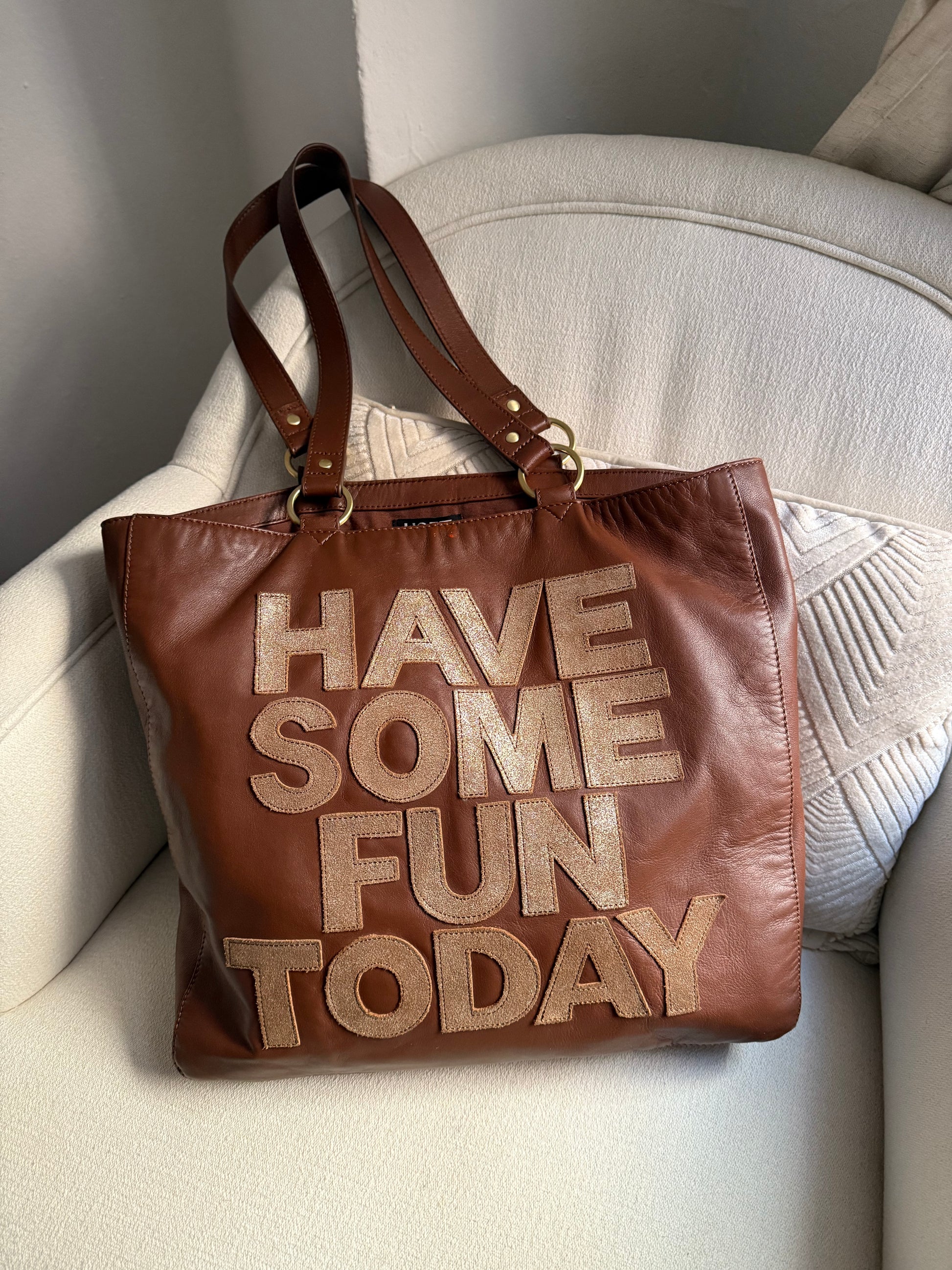The Josie Bag in Luggage is your new go-to for stylish functionality. Crafted from luxurious leather and embellished with an appliqued mantra, this tote is both practical and inspirational.